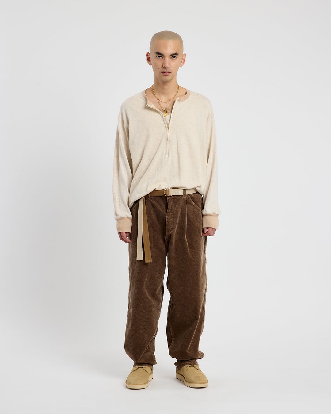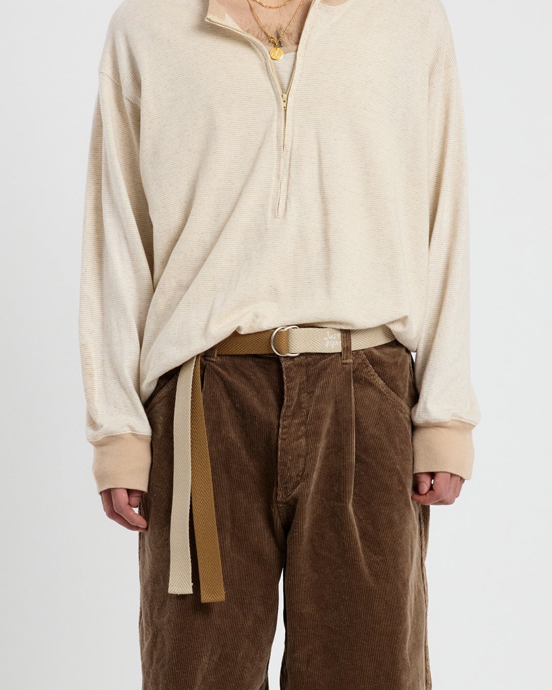 いわゆるコレクションブランドのものでしたが、あんまりモードな顔つきになってしまうと今の気分に合わないので、マットでコットンライクなヘリンボーンテープを採用しました。デニムやコーズ、チノ、軍パンなど、カジュアルなパンツにもバッチリの素材感で、なにより頑丈なのがうれしいポイントです。